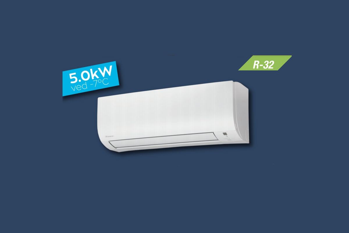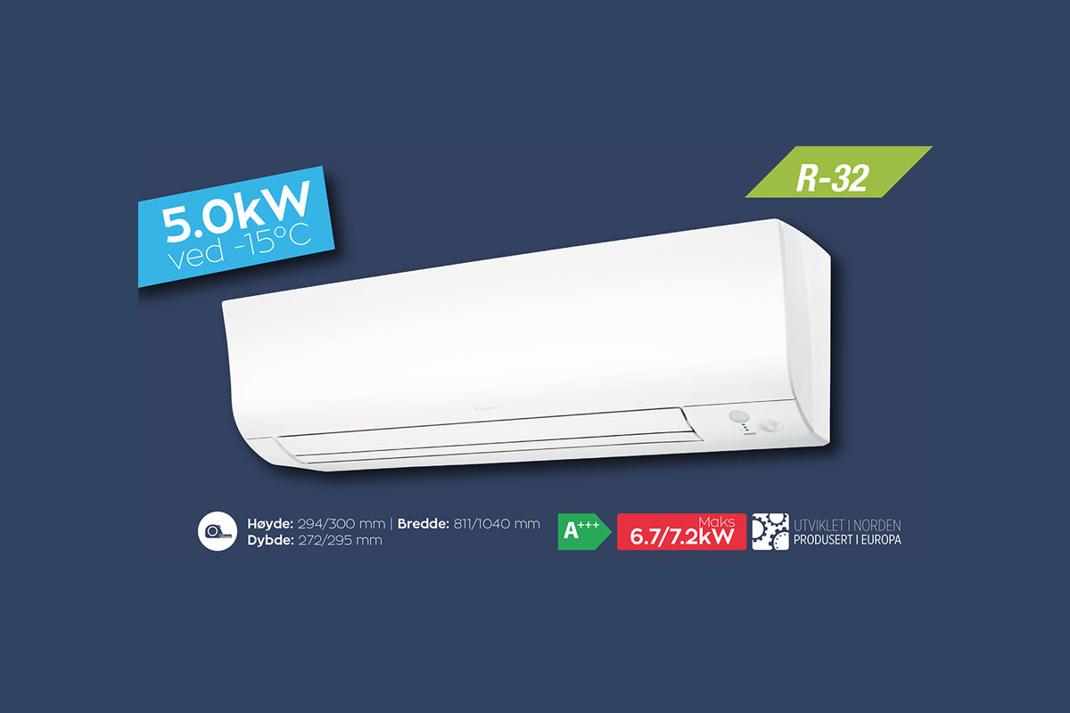 Varmepumpen bygger bare 770 mm på veggen og passer perfekt til nedkjøling. Den har integrert Wifi.